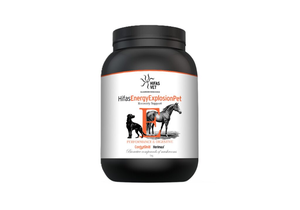 Hifas Energy Explosion Pet este o formulă concentrată pe bază de micelii fermentate din Cordyceps militaris (extract brevetat CORDYZUMIB®Vet) și Hericium erinaceus (HERIMAX®), creată pentru animale supuse efortului fizic și stresului metabolic. Recomandat pentru câini de competiție, de lucru, cai sportivi și animale senior, produsul susține energia musculară, oxigenarea, echilibrul digestiv și imunitar.